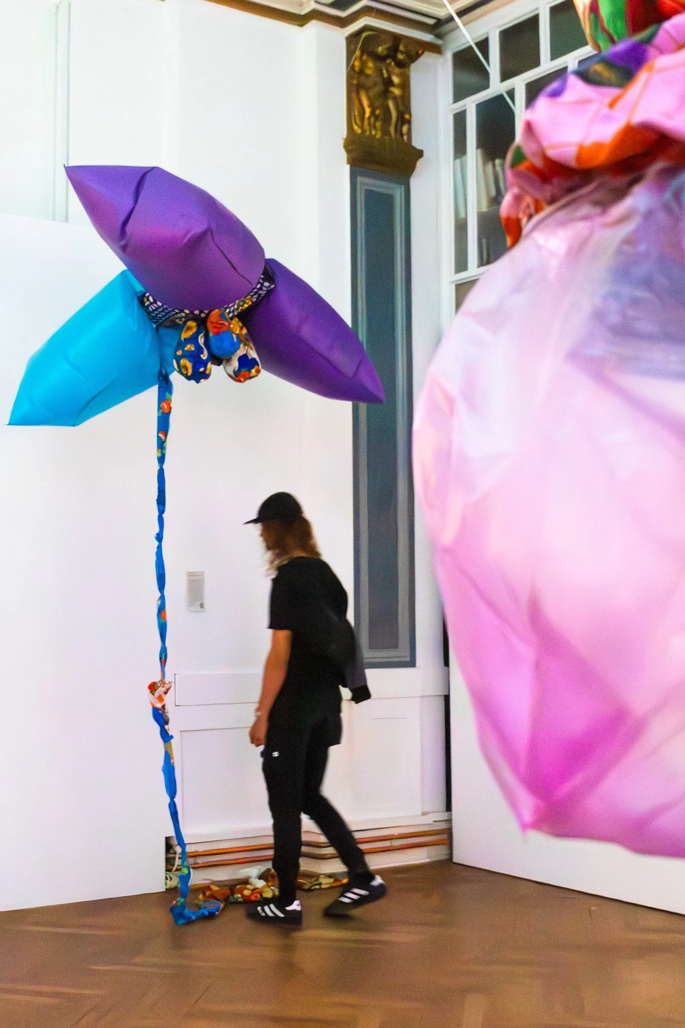 Through time, more of these elements of electro-domestic coverings, as well as the vernacular and popular elements they represent, that make up this mixed culture are seen less as the places are lost and the aesthetic is lost. The project aims to amplify these maximalist aesthetics, creating volumes with fabrics used in mercados in coverings, all materials bought in the areas that still make and sell these elements and materials to fabricate them, the fabric elements fabricated in collaboration in San Salvador to put together with the New Media parts put together in Berlin. The volumes are abstract shapes creating a color scheme with mismatched printed fabric; from a personal standpoint, the shapes are based on the region’s flowers, fruits, and mixed traditions. They create a composition that inflates, deflates, and dims lights brighter as the shapes take up space that isn’t given to marginalized communities.